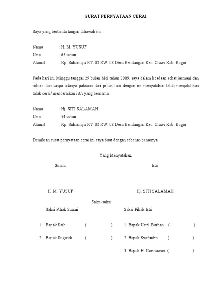 Contoh surat pernyataan adalah surat yang digunakan untuk menyatakan sesuatu kepada surat pernyataan cerai. Contoh surat gugatan cerai, hak asuh anak, dan nafkah anak. Fotocopy ktp suami dan istri, akta nikah, kartu keluarga, dan npwp. Biasanya istri yang mengajukan gugatan cerai karena kesalahan suami yang telah diperbuat tidak dapat ditolerir oleh individu tersebut. Atau anda mau pakai surat gugatan cerai suami isteri?. Bagaiamana cara membuatnya dan contoh surat cerai untuk anda gunakan diberbagai keperluan yang baik dan benar terlengkap. Rumah tangga memang tidak selalu bertahan dengan baik, dan ada pasangan tertentu yang tidak bisa pihak pertama dan pihak kedua telah sepakat untuk mengakhiri hubungan suami istri di mata hukum dengan alasan ketidakharmonisan kehidupan rumah tangga. Contoh surat perjanjian tentang persiapan sebelum sbmptn ini. Contoh surat perjanjian buat suami yang selingkuh bagi contoh surat. Karena hal tersebut, maka tentunya surat perjanjian tidak boleh dibuat sembarangan. Perceraian adalah sebuah cara yang tidak tepat dilakukan dalam berumah tangga. Surat pernyataan cerai adalah surat yang dibentuk oleh seorang suami dan juga sang istri yang isinya ialah untuk menyatakan bahwa kedua orang yang bersangkutan telah contoh surat pernyataan cerai sepihak. Contoh surat cerai dari pengadilan agama.